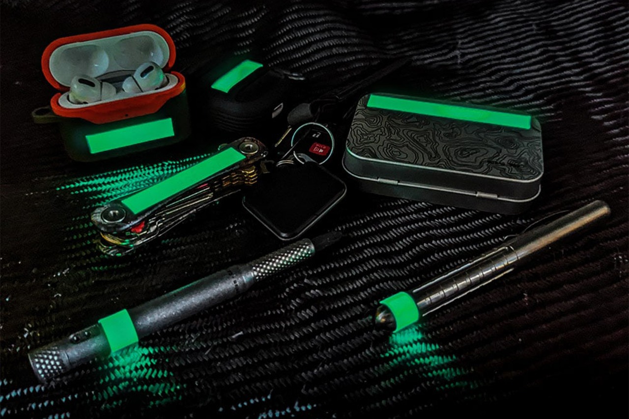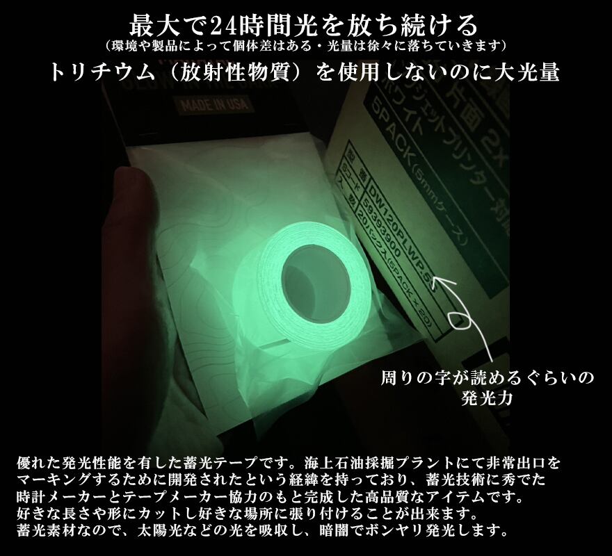 テープロール型の製蓄光マーカーです。海上石油採掘プラントにて非常出口をマーキングするために開発されたという経緯を持っており、蓄光技術に秀でた時計メーカーとテープメーカー協力のもと完成した高品質なアイテム。ハンドツールや鞄など、あらゆる道具のマーカーとして使用することができます。好きな長さ、形にカットし好きな場所に張り付けてください。蓄光素材なので、太陽光などの光を吸収し、暗闇でボンヤリ発光します。